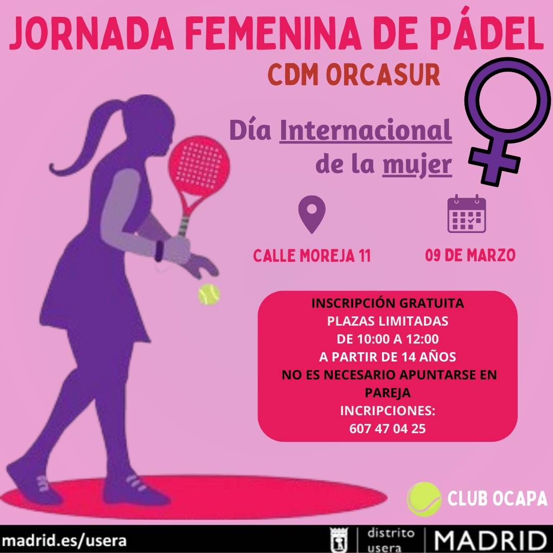 En colaboración con la Junta Municipal de Usera y el CDM Orcasur, pasaremos una mañana divertida con una Jornada Femenina de padel por conmemoración al Día Internacional de la Mujer.