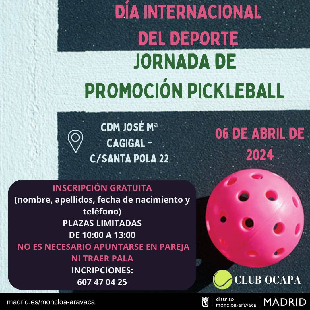 Desde el Club Ocapa y en colaboración con el CDM Jose Mª Cagigal vamos a organizar la quinta jornada de promoción gratuita de pickleball, nuevo deporte que se está incluyendo en todos los polideportivos, vamos a seguir disfrutando con las familias y los amigos de una manera lúdica y totalmente nueva.