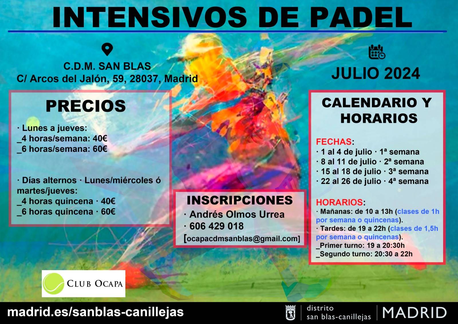 Desde el Club Ocapa continuando con sus actividades de promoción del tenis y pádel en todo el municipio de Madrid también ofrecerá durante el próximo mes de julio de 2024 cursos intensivos de aprendizaje y tecnificación de PÁDEL en el CDM SAN BLAS (Distrito de SAN BLAS-CANILLEJAS) para infantiles, jóvenes y adultos.