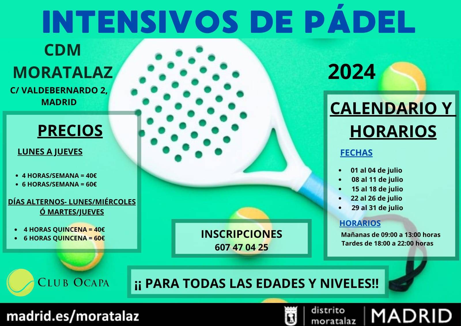 Desde el Club Ocapa, continuando con sus actividades de promoción del tenis y pádel en todo el municipio de Madrid también ofrecerá durante el mes de julio de 2024 cursos intensivos de aprendizaje y tecnificación de PÁDEL en el CDM MORATALAZ (Distrito de MORATALAZ) para infantiles, jóvenes y adultos, de todos los niveles.