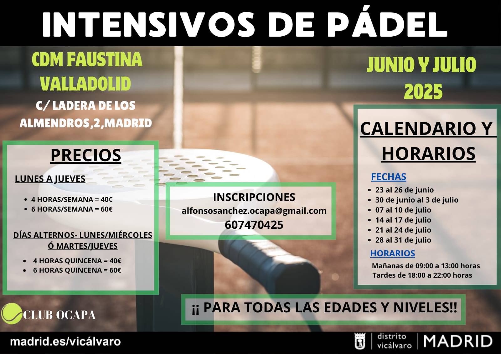 Desde el Club Ocapa, continuando con sus actividades de promoción del tenis y pádel en todo el municipio de Madrid también ofrecerá durante el mes de junio y julio de 2025 cursos intensivos de aprendizaje y tecnificación de PÁDEL en el CDM FAUSTINA VALLADOLID (Distrito de VICÁLVARO) para infantiles, jóvenes y adultos, de todos los niveles.