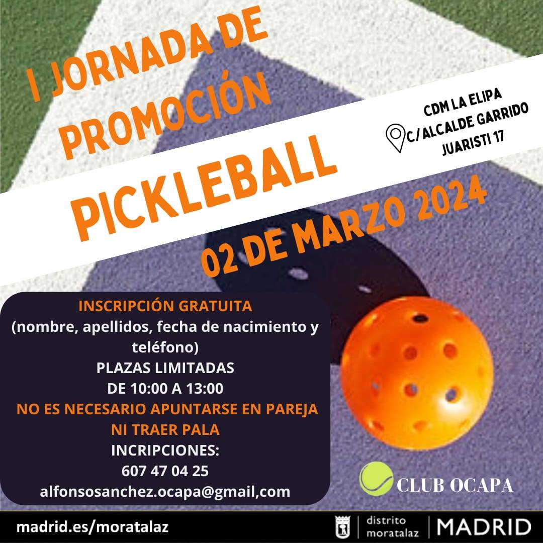 Desde el Club Ocapa y en colaboración con el CDM La Elipa vamos a organizar la cuarta jornada de promoción gratuita de pickleball, nuevo deporte que se está incluyendo en todos los polideportivos, vamos a seguir disfrutando con las familias y los amigos de una manera lúdica y totalmente nueva.