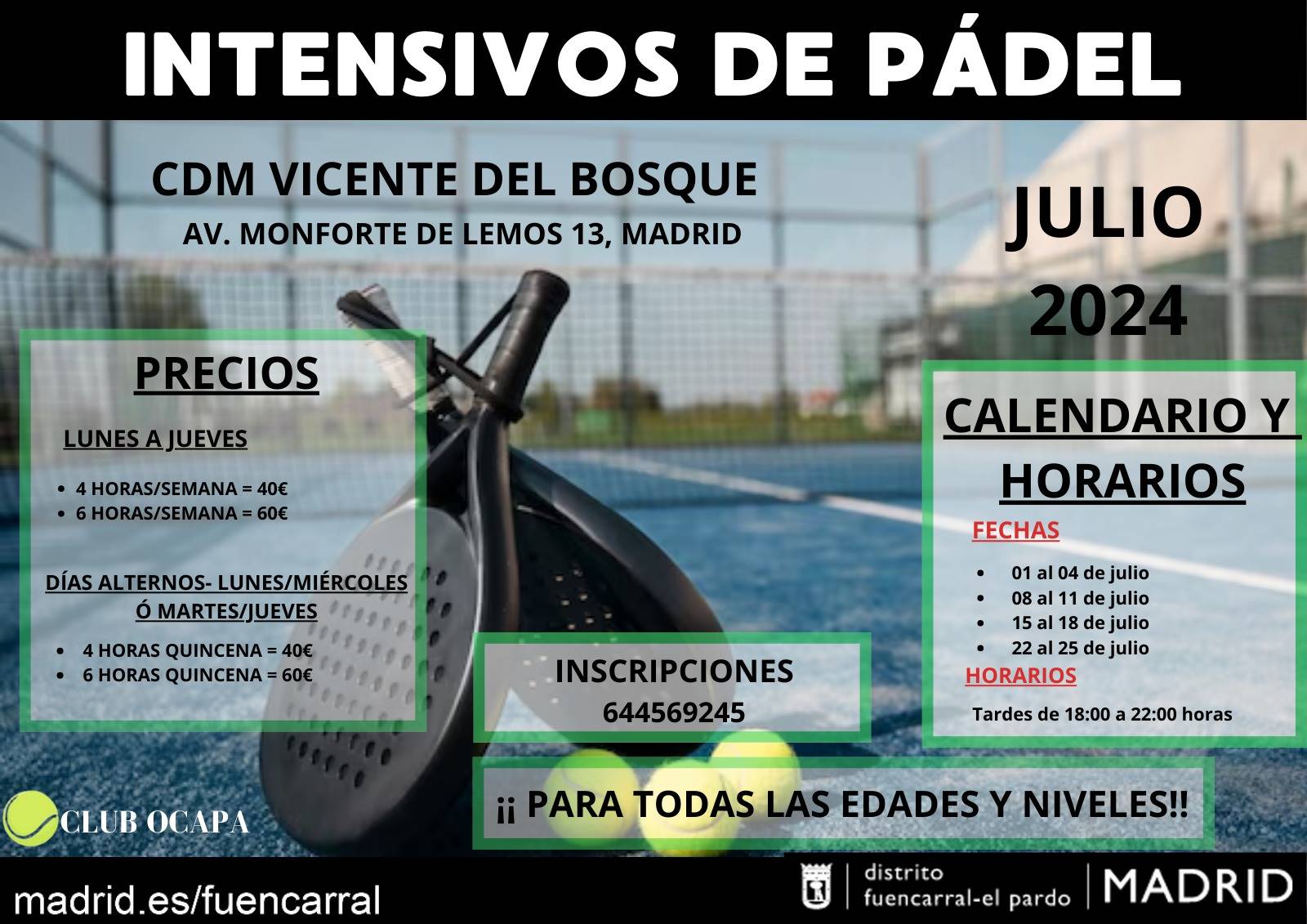 Desde el Club Ocapa, continuando con sus actividades de promoción del tenis y pádel en todo el municipio de Madrid también ofrecerá durante el mes de junio y julio de 2024 cursos intensivos de aprendizaje y tecnificación de PÁDEL en el CDM VICENTE DEL BOSQUE (Distrito de FUENCARRAL-EL PARDO) para infantiles, jóvenes y adultos, de todos los niveles.