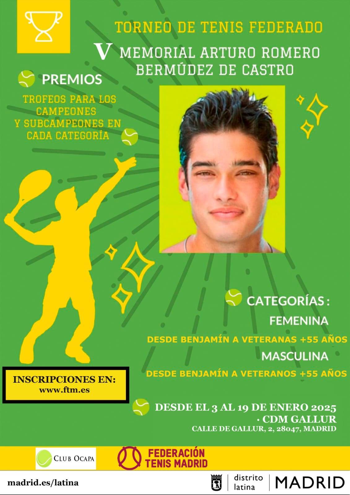 Nos vamos acercando a los últimos días de inscripción, por eso desde el Club Ocapa te invitamos a participar en nuestro torneo federado de tenis masculino y femenino V Memorial Arturo Romero Bermúdez De Castro en el CDM Gallur.