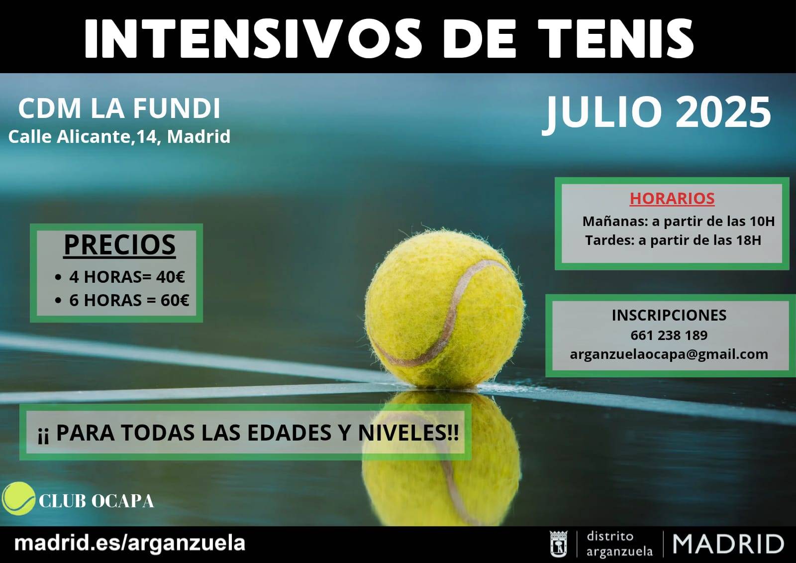 Desde el Club Ocapa, continuando con sus actividades de promoción del tenis y pádel en todo el municipio de Madrid también ofrecerá durante el próximo mes de julio de 2025 cursos intensivos de aprendizaje y tecnificación de TENIS en la CDM LA FUNDI (Distrito de ARGANZUELA) para todas las edades.